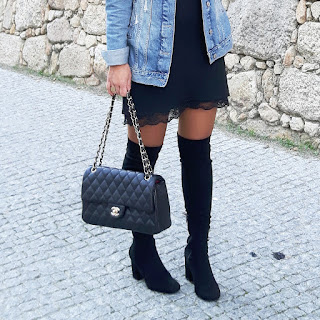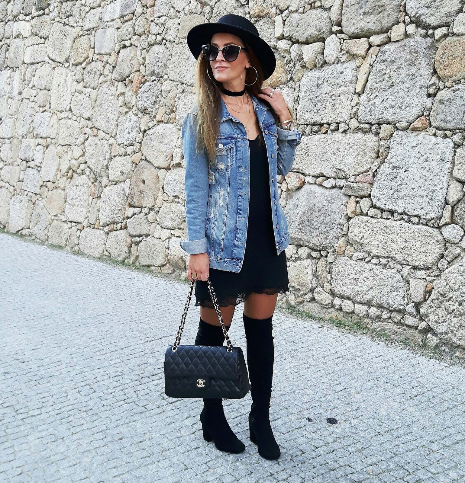 Chapéu / Hat - Bershka | óculos de sol / Sunnies - Stradivarius | blusão em ganga , vestido e botas / Denim jacket , dress and boots - Zara | mala / bag - Chanel - Aliexpress .
